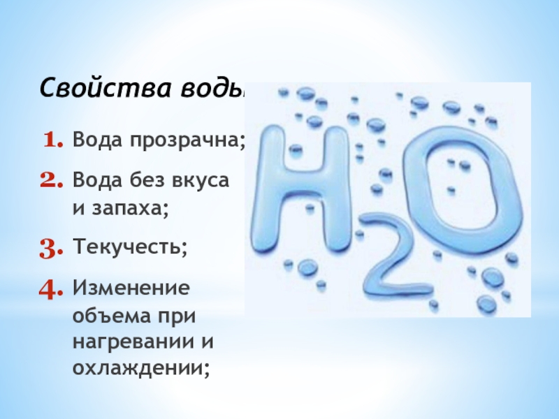 Свойства водыВода прозрачна;Вода без вкуса и запаха;Текучесть;Изменение объема при нагревании и охлаждении;