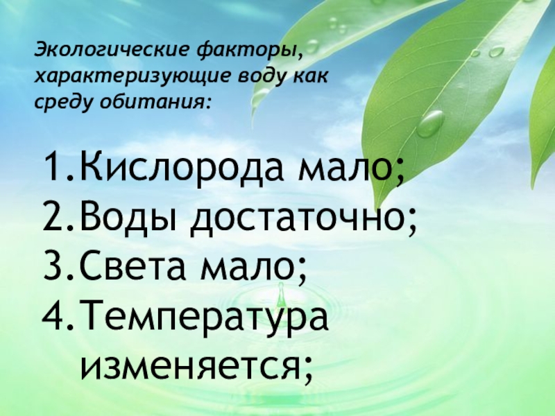 Экологические факторы, характеризующие воду как среду обитания:Кислорода мало;Воды достаточно;Света мало;Температура изменяется;