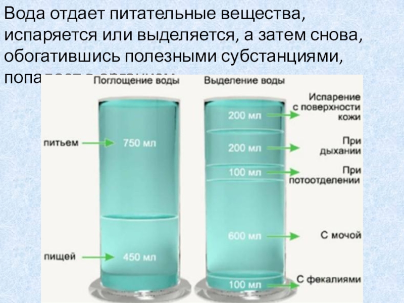 Слайд 9Вода отдает питательные вещества, испаряется или выделяется, а затем снова, обогатившись