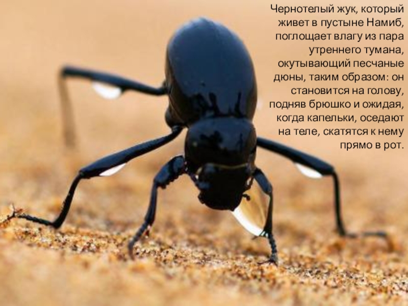 Слайд 17Чернотелый жук, который живет в пустыне Намиб, поглощает влагу из пара