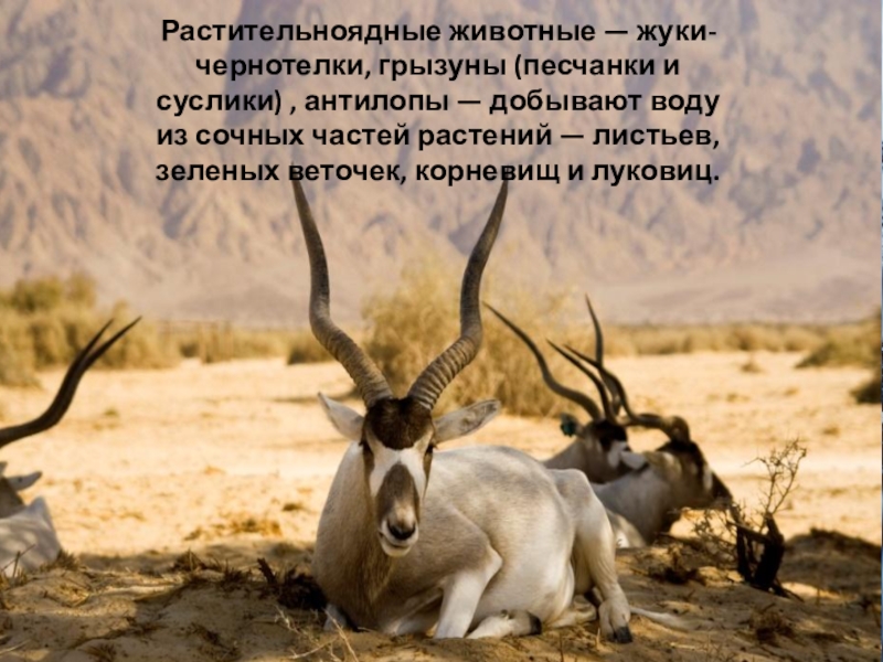 Слайд 15Растительноядные животные — жуки-чернотелки, грызуны (песчанки и суслики) , антилопы —