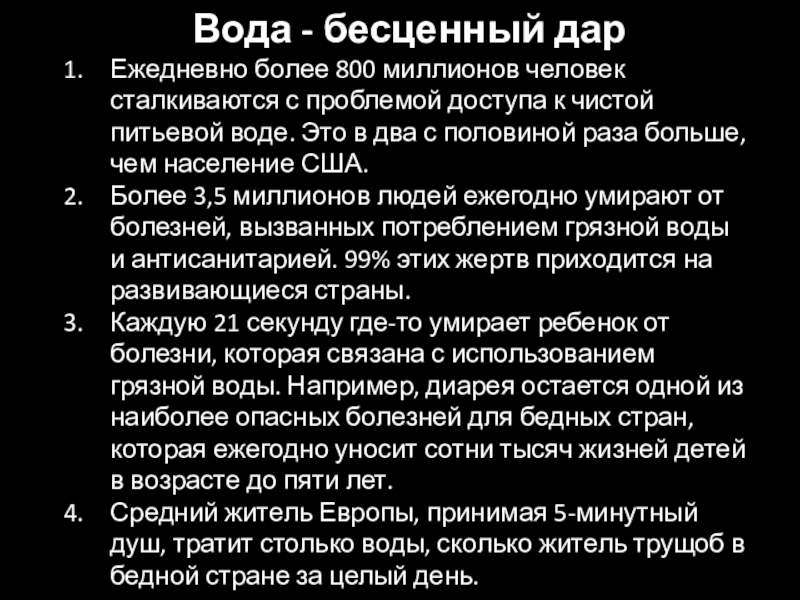 Средний житель Европы, принимая 5-минутный душ, тратит столько воды, сколько житель трущоб в бедной стране за целый день.