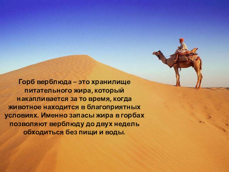 Слайд 14Горб верблюда – это хранилище питательного жира, который накапливается за то