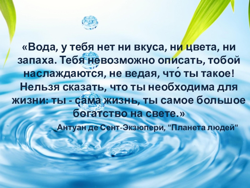 Слайд 24«Вода, у тебя нет ни вкуса, ни цвета, ни запаха. Тебя