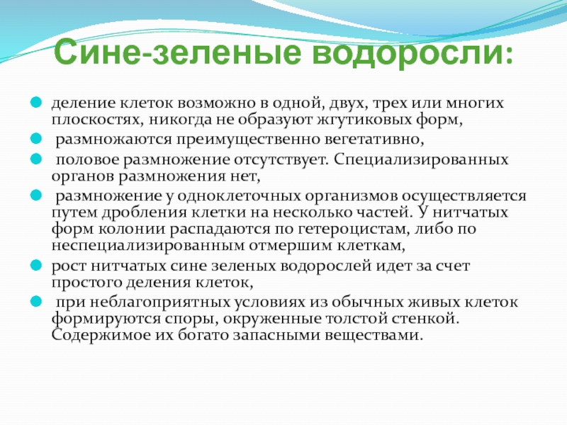 размножение у одноклеточных организмов осуществляется путем дробления клетки на несколько частей. У нитчатых форм колонии распадаются по гетероцистам, либо по неспециализированным отмершим клеткам,