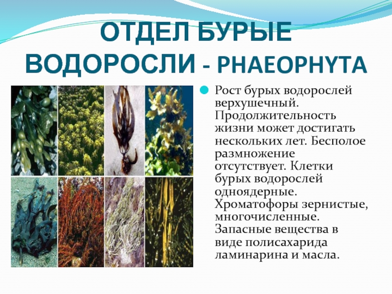 достигать нескольких лет. Бесполое размножение отсутствует. Клетки бурых водорослей одноядерные. Хроматофоры зернистые, многочисленные. Запасные вещества в виде полисахарида ламинарина и масла.