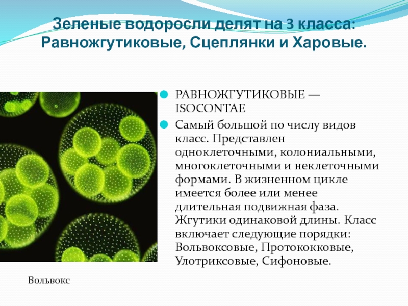 Слайд 17Зеленые водоросли делят на 3 класса: Равножгутиковые, Сцеплянки и Харовые.
