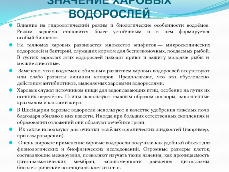 Слайд 23ЗНАЧЕНИЕ ХАРОВЫХ ВОДОРОСЛЕЙ
