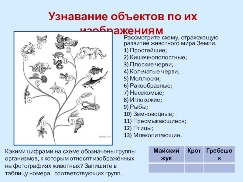 Какими цифрами на схеме обозначены группы организмов, к которым относят изображённых на фотографиях животных? Запишите в таблицу номера соответствующих групп.