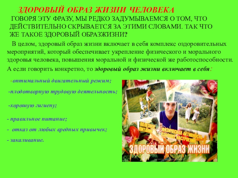 В целом, здоровый образ жизни включает в себя комплекс оздоровительных мероприятий, который обеспечивает укрепление физического и морального здоровья человека, повышения моральной и физической же работоспособности. А если говорить конкретно, то здоровый образ жизни включает в себя: