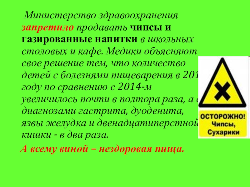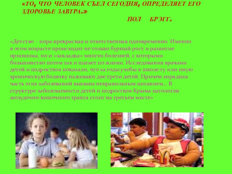 «Детство – пора прекрасная и ответственная одновременно. Именно в этом возрасте происходит не только бурный рост и развитие организма, но и «закладка» многих болезней, с которыми большинство потом так и шагает по жизни. Исследования врачами детей и подростков показали, что за годы учебы в школе ту или иную хроническую болячку наживают две трети детей. Причем изрядная часть этих заболеваний вызвана неправильным питанием… В структуре заболеваемости детей и подростков Крыма патология желудочно-кишечного тракта стоит на третьем месте»