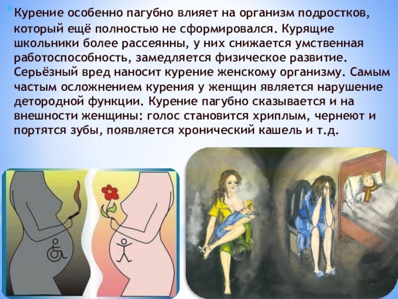 сформировался. Курящие школьники более рассеянны, у них снижается умственная работоспособность, замедляется физическое развитие. Серьёзный вред наносит курение женскому организму. Самым частым осложнением курения у женщин является нарушение детородной функции. Курение пагубно сказывается и на внешности женщины: голос становится хриплым, чернеют и портятся зубы, появляется хронический кашель и т.д.