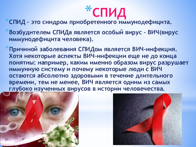 Причиной заболевания СПИДом является ВИЧ-инфекция. Хотя некоторые аспекты ВИЧ-инфекции еще не до конца понятны: например, каким именно образом вирус разрушает иммунную систему и почему некоторые люди с ВИЧ остаются абсолютно здоровыми в течение длительного времени, тем не менее, ВИЧ является одним из самых глубоко изученных вирусов в истории человечества.