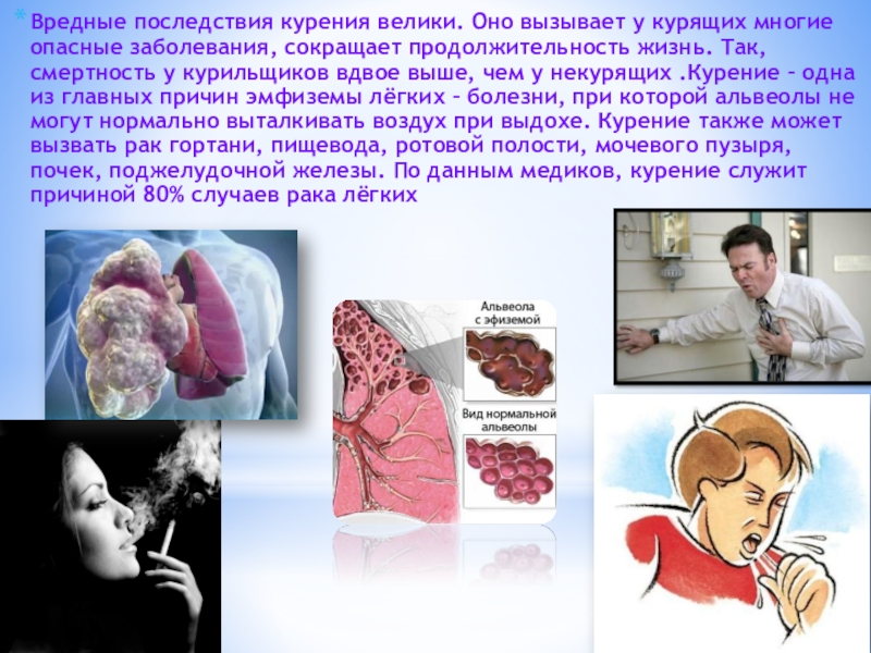 сокращает продолжительность жизнь. Так, смертность у курильщиков вдвое выше, чем у некурящих .Курение – одна из главных причин эмфиземы лёгких – болезни, при которой альвеолы не могут нормально выталкивать воздух при выдохе. Курение также может вызвать рак гортани, пищевода, ротовой полости, мочевого пузыря, почек, поджелудочной железы. По данным медиков, курение служит причиной 80% случаев рака лёгких