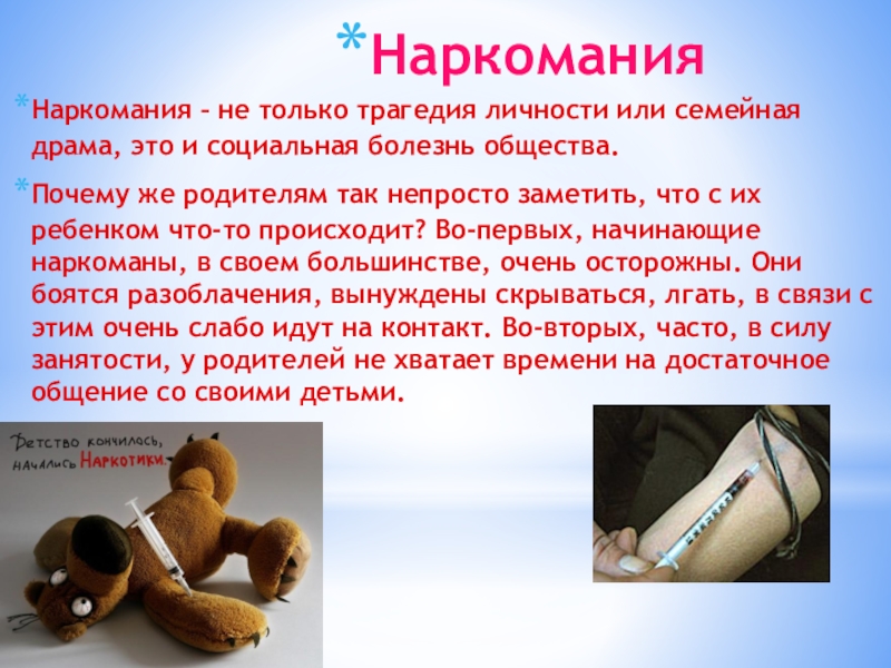 Почему же родителям так непросто заметить, что с их ребенком что-то происходит? Во-первых, начинающие наркоманы, в своем большинстве, очень осторожны. Они боятся разоблачения, вынуждены скрываться, лгать, в связи с этим очень слабо идут на контакт. Во-вторых, часто, в силу занятости, у родителей не хватает времени на достаточное общение со своими детьми.