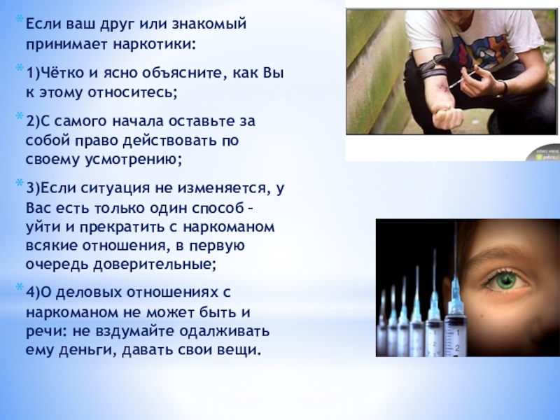 Слайд 14Если ваш друг или знакомый принимает наркотики: