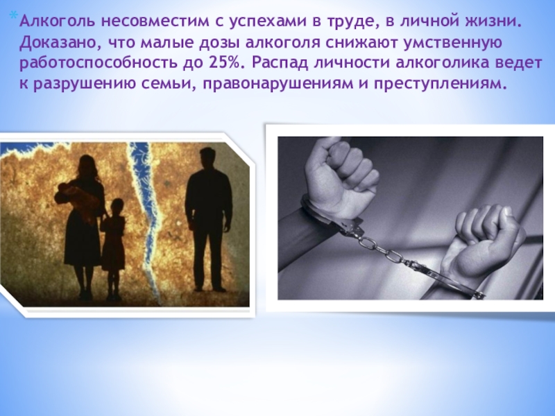 малые дозы алкоголя снижают умственную работоспособность до 25%. Распад личности алкоголика ведет к разрушению семьи, правонарушениям и преступлениям.