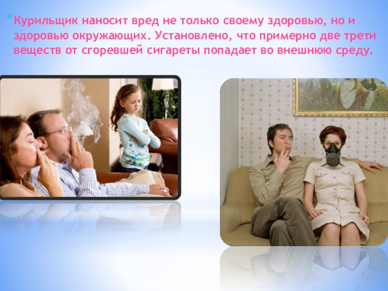 Слайд 7Курильщик наносит вред не только своему здоровью, но и здоровью окружающих.