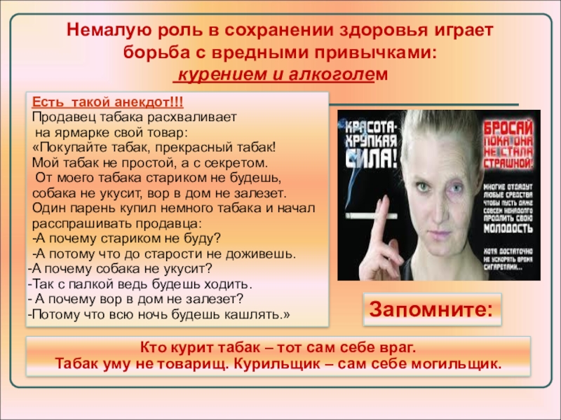 Табак уму не товарищ. Курильщик – сам себе могильщик.