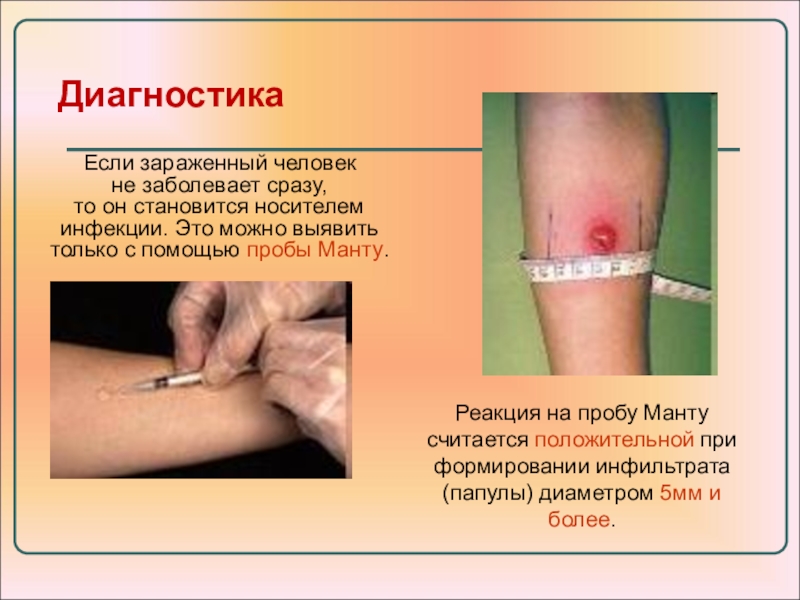 Реакция на пробу Манту считается положительной при формировании инфильтрата (папулы) диаметром 5мм и более.