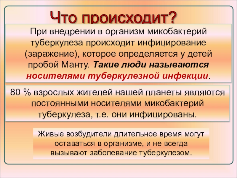 80 % взрослых жителей нашей планеты являются постоянными носителями микобактерий туберкулеза, т.е. они инфицированы.