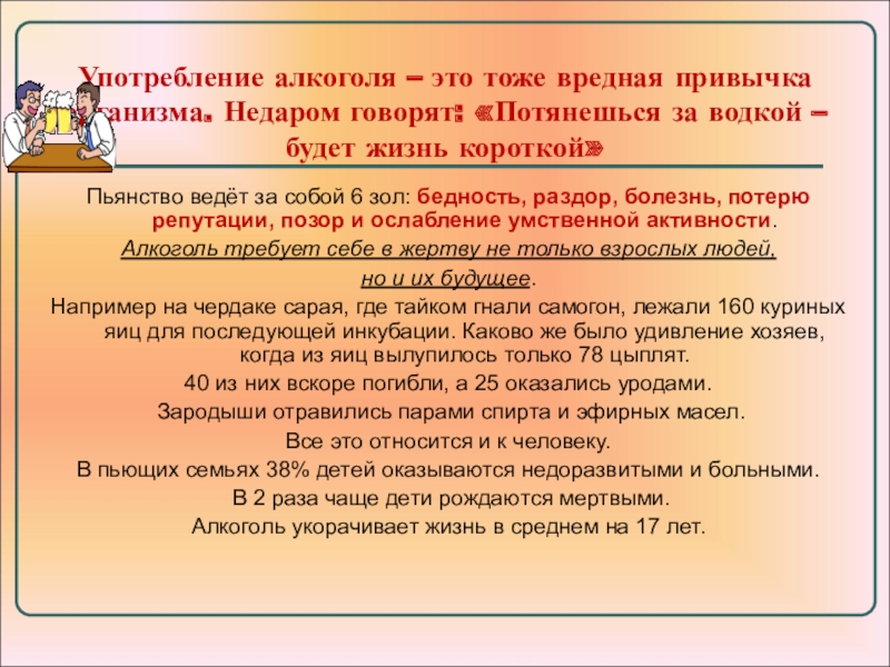 Алкоголь укорачивает жизнь в среднем на 17 лет.