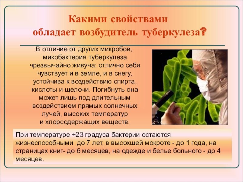 При температуре +23 градуса бактерии остаются жизнеспособными до 7 лет, в высохшей мокроте - до 1 года, на страницах книг- до 6 месяцев, на одежде и белье больного - до 4 месяцев.