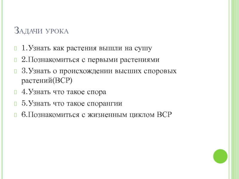 Задачи урока1.Узнать как растения вышли на сушу2.Познакомиться с первыми растениями3.Узнать о происхождении высших споровых растений(ВСР)4.Узнать что такое