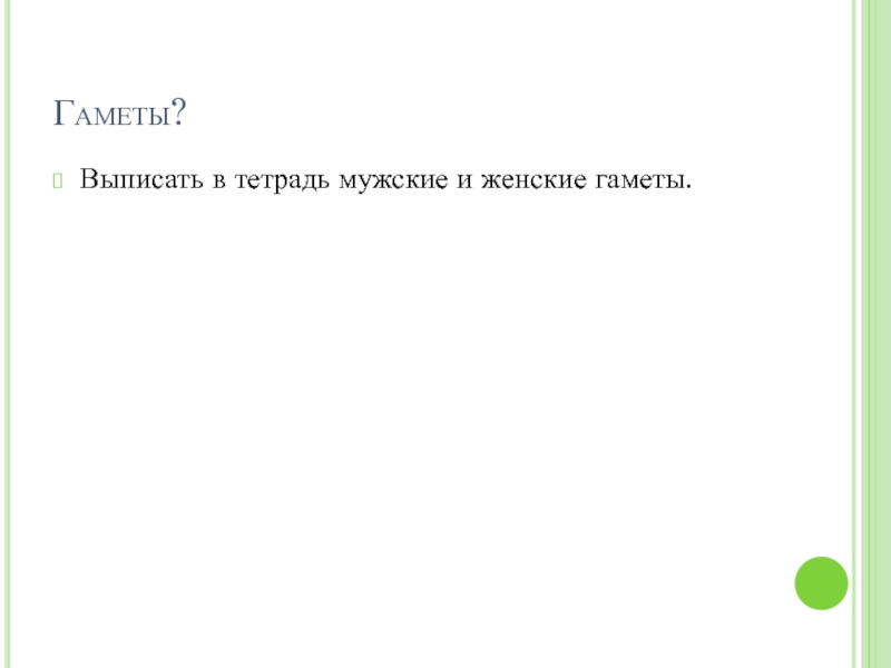 Гаметы?Выписать в тетрадь мужские и женские гаметы.