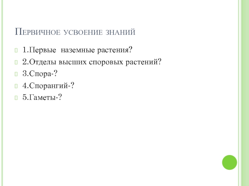 Первичное усвоение знаний1.Первые наземные растения?2.Отделы высших споровых растений?3.Спора-?4.Спорангий-?5.Гаметы-?