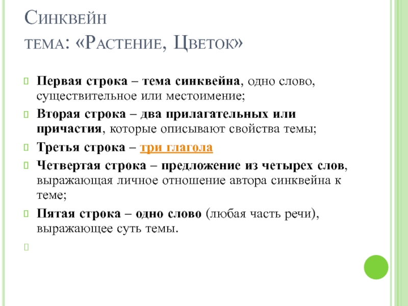 Синквейн тема: «Растение, Цветок» Первая строка – тема синквейна, одно слово, существительное или местоимение;Вторая строка – два