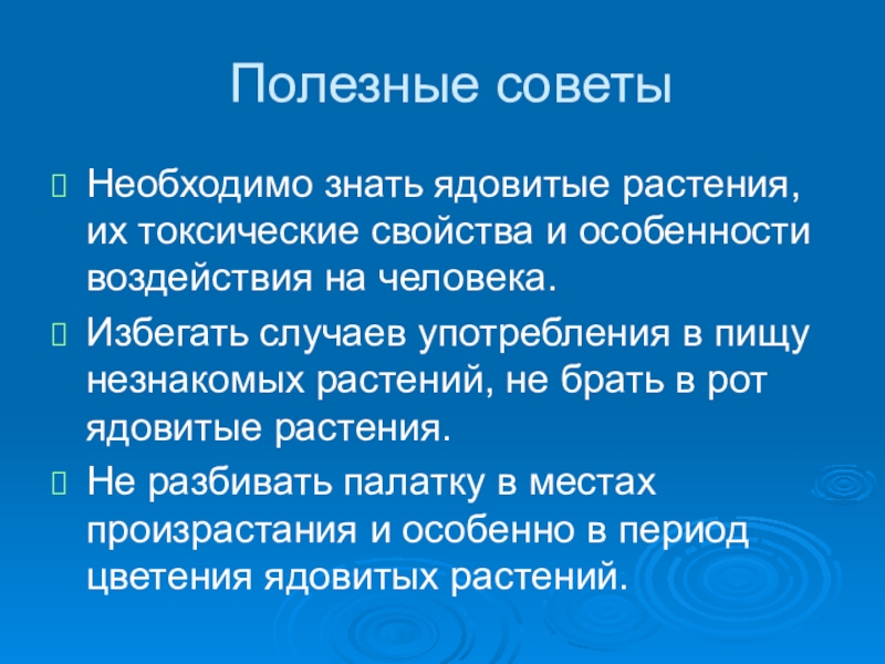 Не разбивать палатку в местах произрастания и особенно в период цветения ядовитых растений.