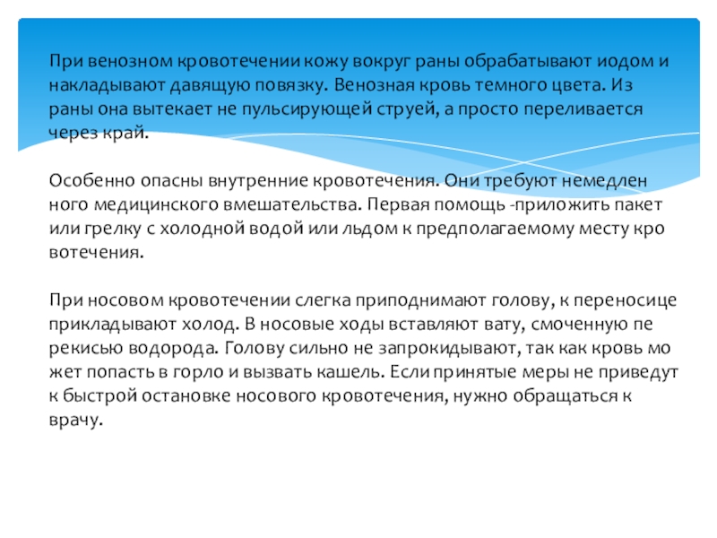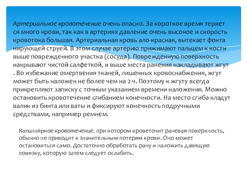Капиллярное кровотечение. при котором кроветочит раневая поверхность, обычно не приводит к значительным потерям крови. Оно может остановиться само. Достаточно обработать рану и наложить давящую повязку, которую затем следует ослабить.