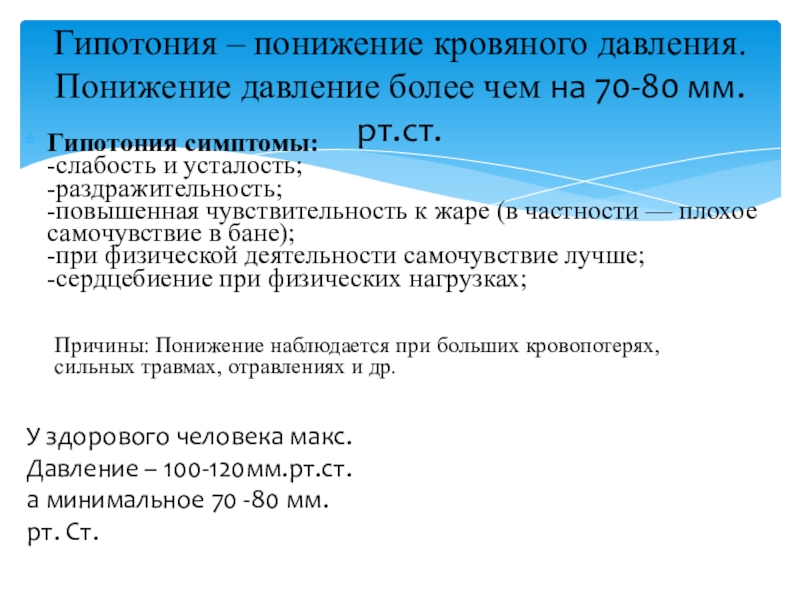 Причины: Понижение наблюдается при больших кровопотерях, сильных травмах, отравлениях и др.