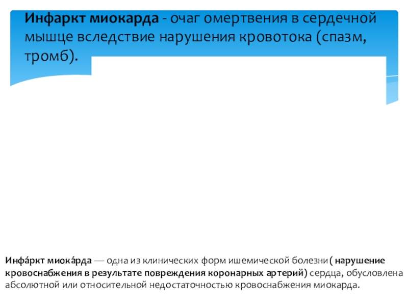 Инфа́ркт миока́рда — одна из клинических форм ишемической болезни( нарушение кровоснабжения в результате повреждения коронарных артерий) сердца, обусловлена абсолютной или относительной недостаточностью кровоснабжения миокарда.