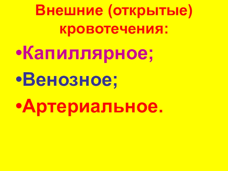 Внешние (открытые) кровотечения:Капиллярное;Венозное;Артериальное.