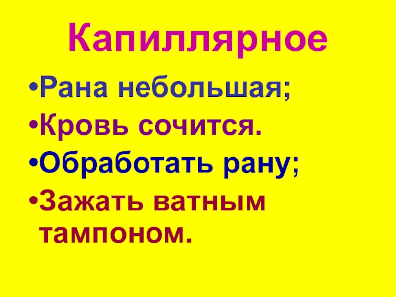 КапиллярноеРана небольшая;Кровь сочится. Обработать рану;Зажать ватным тампоном.