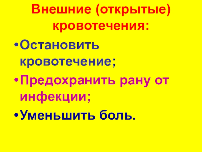 Внешние (открытые) кровотечения:Остановить кровотечение;Предохранить рану от инфекции;Уменьшить боль.