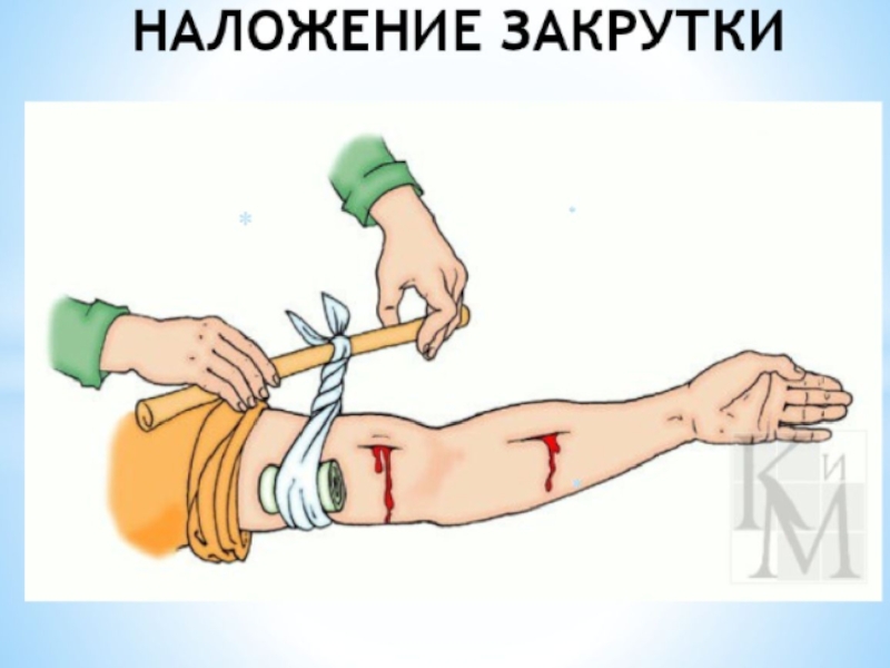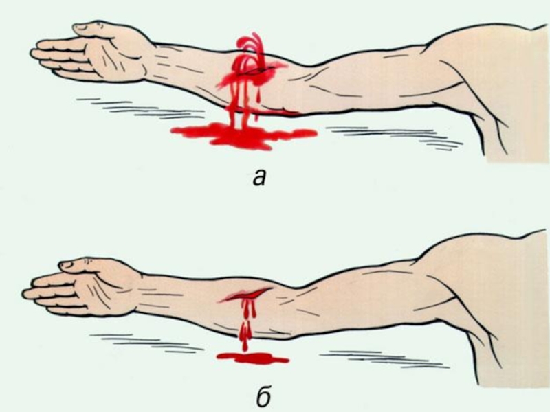 АртериальноеЯрко алая кровь;Пульсирующая струя;Наложить жгут (или закрутку);Обработать рану;Наложить повязку.