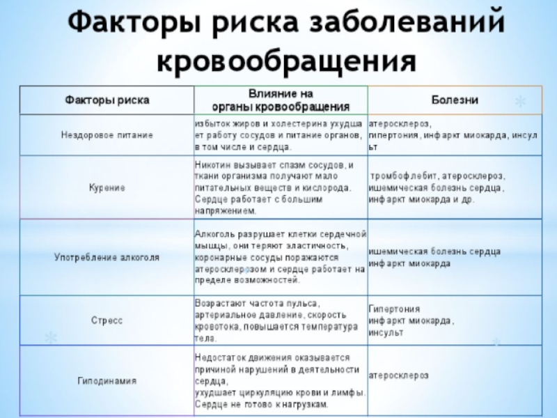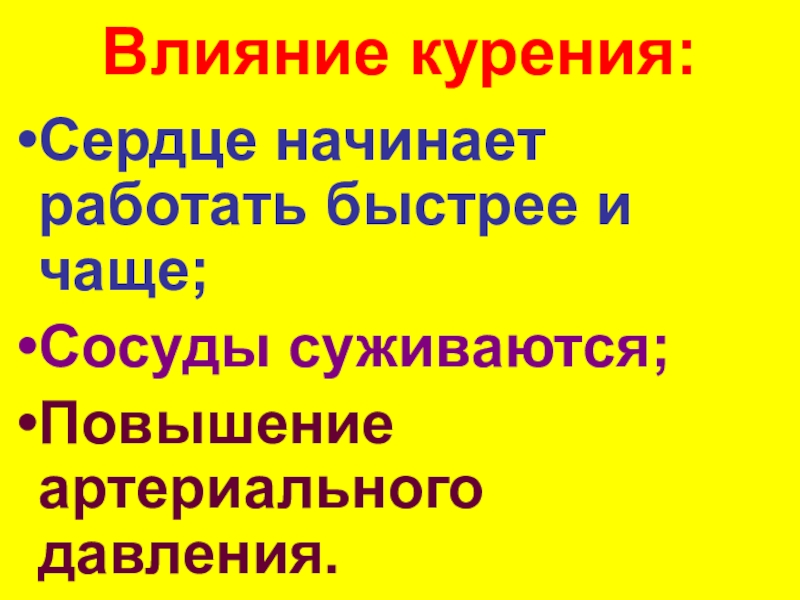 Влияние курения:Сердце начинает работать быстрее и чаще;Сосуды суживаются;Повышение артериального давления.