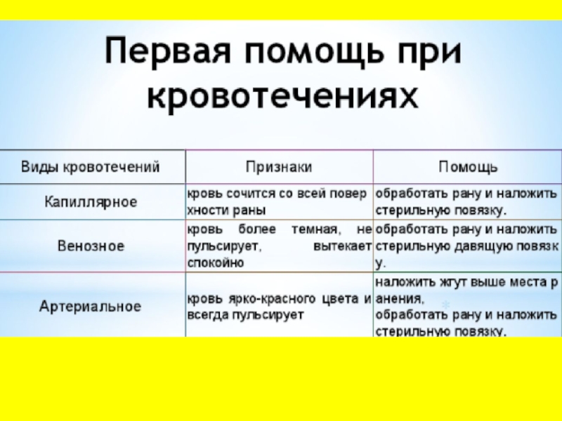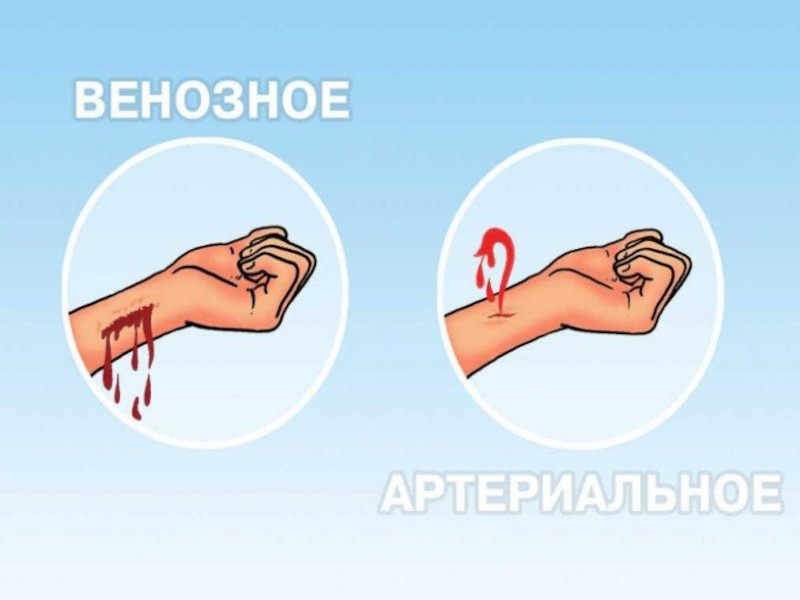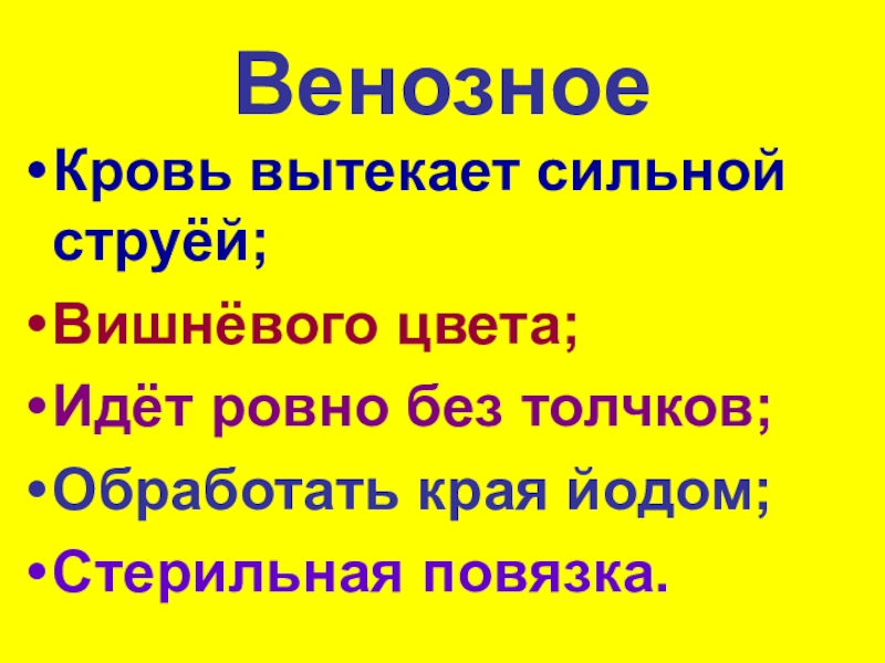 ВенозноеКровь вытекает сильной струёй;Вишнёвого цвета;Идёт ровно без толчков;Обработать края йодом;Стерильная повязка.