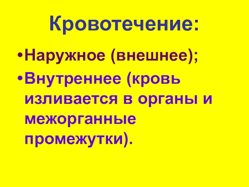 Кровотечение:Наружное (внешнее);Внутреннее (кровь изливается в органы и межорганные промежутки).