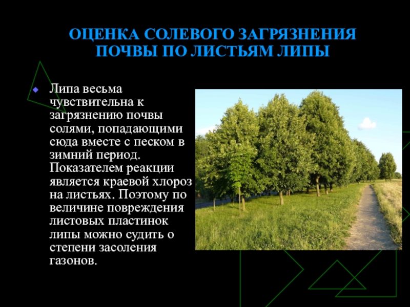 Слайд 11ОЦЕНКА СОЛЕВОГО ЗАГРЯЗНЕНИЯ ПОЧВЫ ПО ЛИСТЬЯМ ЛИПЫ