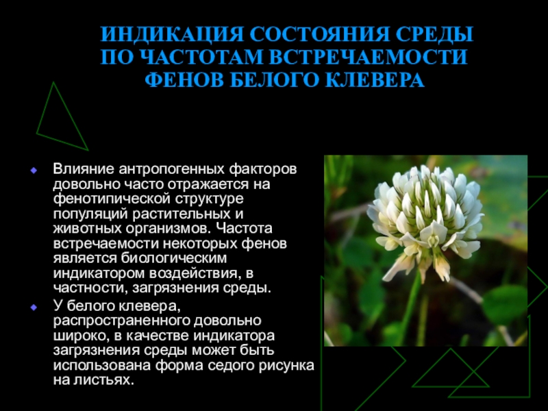 У белого клевера, распространенного довольно широко, в качестве индикатора загрязнения среды может быть использована форма седого рисунка на листьях.