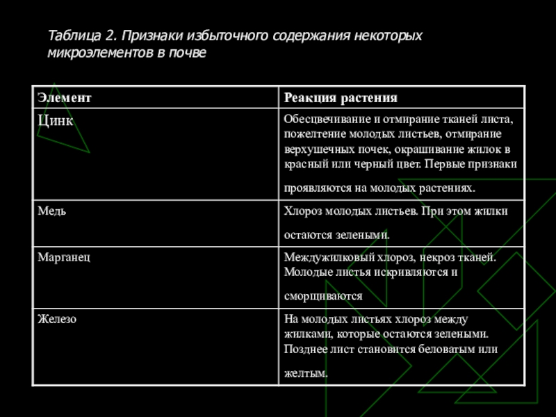 Таблица 2. Признаки избыточного содержания некоторых микроэлементов в почве