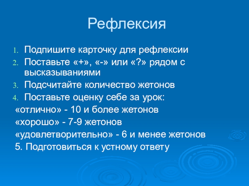 РефлексияПодпишите карточку для рефлексииПоставьте «+», «-» или «?» рядом с высказываниями Подсчитайте количество жетоновПоставьте оценку себе за