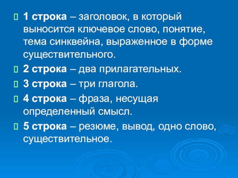 1 строка – заголовок, в который выносится ключевое слово, понятие, тема