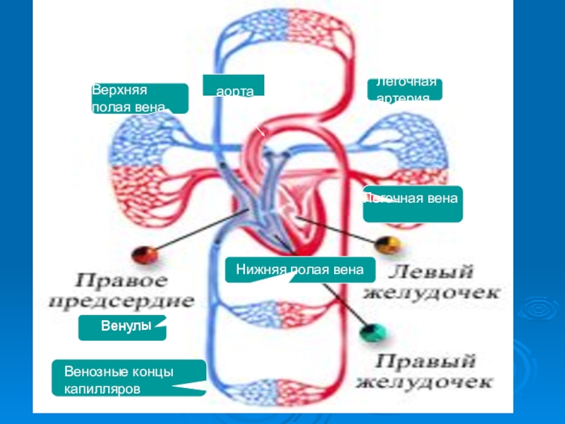 Нижняя полая венааортаЛегочнаяартерияЛегочная венаВерхняя полая венаВенозные концы капилляровВенулы
