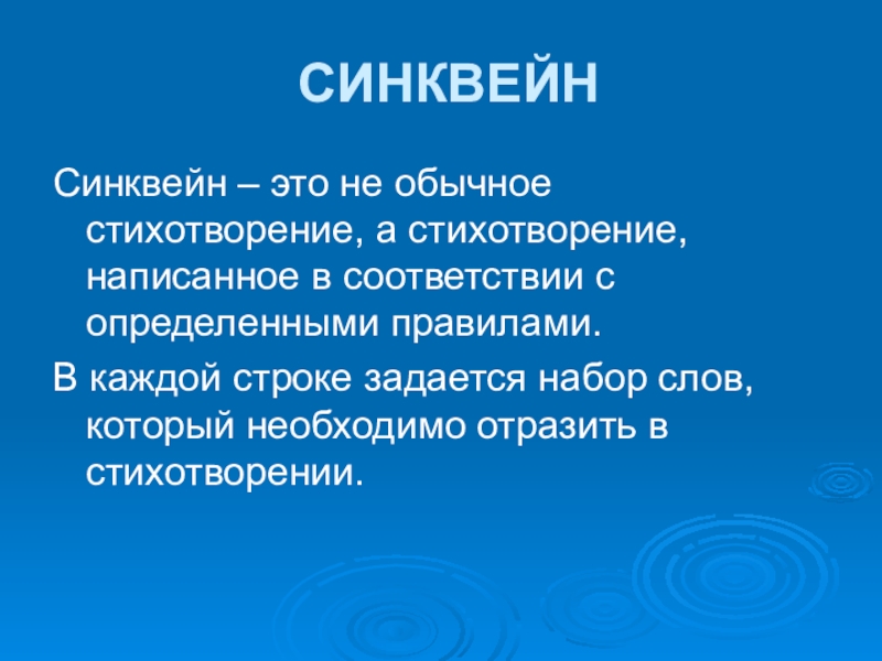 СИНКВЕЙНСинквейн – это не обычное стихотворение, а стихотворение, написанное в соответствии с определенными правилами. В каждой строке