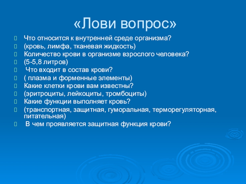 «Лови вопрос»Что относится к внутренней среде организма? (кровь, лимфа, тканевая жидкость) Количество крови в организме взрослого человека?
